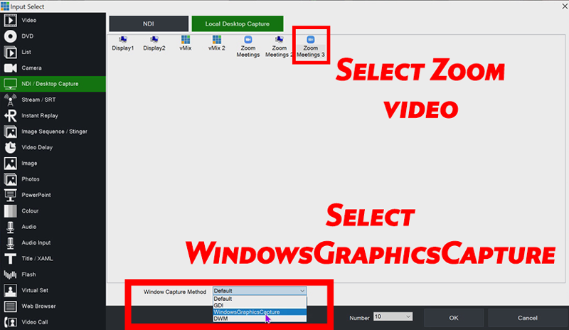 Once your guests have joined your Zoom meeting, we can now add them into vMix. To add the video, select the Add Input button from the bottom left corner. Then select the NDI / Desktop Capture tab. Choose the Local Desktop Capture button from the top. From here, we need to select the Zoom window displaying your video, which is usually the last number. Then you will need to select  WindowsGraphicsCapture from the Windows Capture Method Dropdown. Then Click OK.